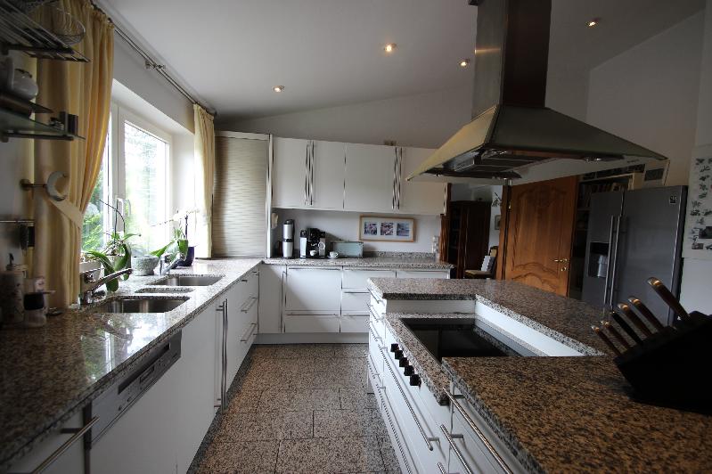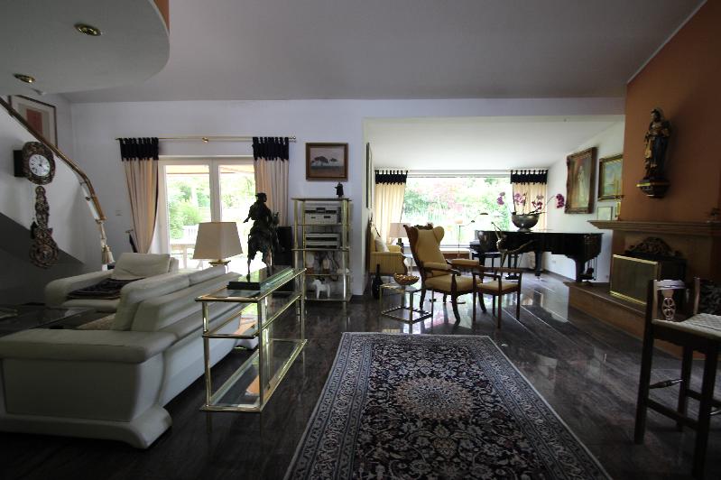 Zum Verkauf steht ein großzügiges, hochwertig ausgestattetes Einfamilienhaus in bevorzugter Ruhiglage (Höhenlage) in Rheinbreitbach. Die Grundstücksgröße beträgt 927 m² (laut Boris RLP liegt der Bodenpreis 2024 für Bauland in der Lage bei 230 EUR pro m² - es sind aber keine Grundstücke mehr verfügbar in der Lage). Das Gebäude wurde 1972 in massiver Bauweise mit Vollkeller errichtet und 1990 kernsaniert und umgebaut. Die Hauptwohnung befindet sich im Erdgeschoss (Diele/Flur, Esszimmer, Küche, Wohnzimmer, Ankleide, Schlafzimmer, Badezimmer, Gäste-WC) und im Obergeschoss (Galerie, Büro, Studio, Badezimmer, Schlafzimmer, Wohnbereich, Dachterrasse, zwei Abstellräume). Die gesamte Wohnfläche auf den beiden Etagen beträgt ca. 245 m². Die Wohnflächenberechnung mit den Größen der einzelnen Räume können Sie dem Exposé entnehmen. Wenn Sie das Haus über die repräsentative Eingangstür betreten, gelangen Sie zunächst rechts in das helle Esszimmer. Vom Esszimmer aus gelangen Sie in die große Wohnküche - ausgestattet mit einer hochwertigen Bulthaup-Einbauküche inklusive aller elektrischen Geräte. Von der Küche und auch vom Esszimmer aus gelangt man in das große, repräsentative Wohnzimmer mit Granitfußboden, offenem Kamin und Galerie. Das Wohnzimmer ist sehr hell, hochwertig ausgestattet und es verfügt über bodentiefe Fenster. Die beiden Terrassen (Giebelseite und Rückseite des Gebäudes) sind über das Wohnzimmer erreichbar - ebenso der Garten. Ein weiteres Highlight im Erdgeschoss in der Hauptwohnung ist das überaus große, luxuriöse Luxusbadezimmer mit einer Größe von über 23 m². Das ca. 51 m² große Wohnzimmer mit der zur Galerie hin offene Wohnbereich in Verbindung mit dem großen Kamin bieten eine repräsentative Wohlfühlatmosphäre. Vom Wohnzimmer aus führt eine massive Treppe auf die Galerie und ins Obergeschoss. Bei der Auswahl der hochwertigen Materialien bei der Ausstattung und des Interieurs wurde nicht gespart und Wert auf Langlebigkeit und Exklusivität gelegt. Im Souterrain befindet sich eine Einliegerwohnung mit ca. 113 m² Wohnfläche (Flur, Diele, Wohnzimmer, Schlafzimmer, Badezimmer, Küche, zweites Badezimmer, Hobbyraum/Gästezimmer/Büro sowie eine Terrasse). Die Einliegerwohnung steht derzeit nicht zum Verkauf. Im Souterrain/Keller befinden sich auch die Nutzflächen. Des Weiteren verfügt das Haus über einen Weinkeller. Beheizt wird das gesamte Gebäude über eine Viessmann-Ölheizung mit Warmwasser-Aufbereitung. Die Heizung ist selbstverständlich im separaten Heizungsraum untergebracht. Der Gesamtzustand des Gebäudes ist sehr gepflegt. Die Immobilie wurde stets instandgehalten es besteht kein Sanierungsstau. Ein weiteres Highlight ist der schön angelegte Garten auf dem gut geschnittenen, rechteckigen Grundstück. Hinter den beiden schon beschriebenen großen Terrassen (mit Grillplatz) liegt ein kleines Biotop. Hier befindet sich ein Teich mit Schilfbewuchs. Das nächste Highlight ist die gemütliche und durchaus geräumige Enzianhütte mit Überdachung zum Draußen sitzen. Die Hütte ist beheizbar und wie eine Berghütte als Gästehaus nutzbar. Sie ist liebevoll eingerichtet und verfügt sogar über eine Zapfanlage und eine Theke. Zum Anwesen gehören eine große Garage, ein Carport und zwei weitere PKW-Stellplätze links am Gebäude. Der Energieausweis liegt bei Effizienzklasse F und der Endenergiebedarf liegt bei 190,3 kWh/(m²·a). Die beiden Wohneinheiten sind wirtschaftlich voneinander getrennt, es existiert eine Teilungserklärung. Die Einliegerwohnung wird nicht mit verkauft, sie verfügt über einen eigenen Hauseingang.