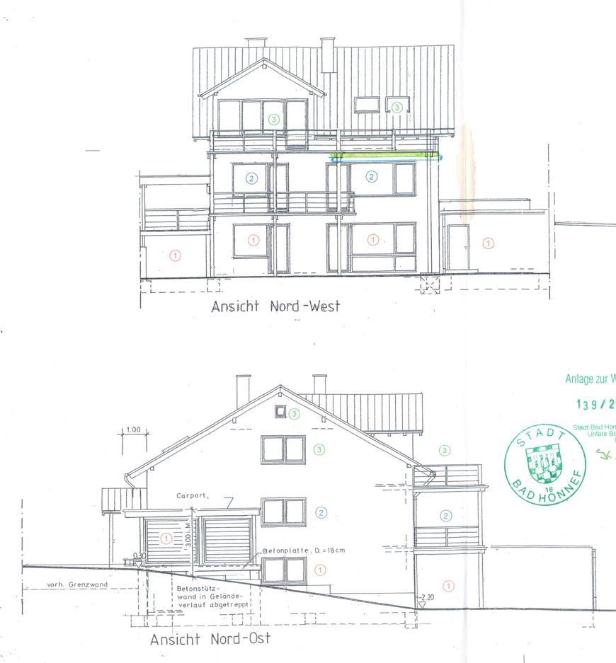 Die Wohnung befindet sich im Erdgeschoss eines gepflegten, freistehenden Dreifamilienhaus mit drei abgeschlossenen Wohnungen in Bad Honnef im Ortsteil Wülscheid. Zur angebotenen Wohung gehört ein großes Carport und ein PKW-Stellplatz. Beheizt wird das Haus mit einer modernen Viessmann-Gasheizung mit Warmwasseraufbereitung. Einige Komponenten der Heizung wurden vor kurzem erneuert (Kostenpunkt 1.500 EUR). Die Elektrik ist überholt worden. Das neue Dach wurde mit engobierten/beschichteten Betondachziegel eingedeckt. Außerdem gehört eine Regenwasser-Zisterne mit 4000 Liter Fassungsvermögen (Vormals Klärgrube) mit Hauswasserwerk zur Gartenbewässerung und eine Entkalkungsanlage zum Haus. Das 669 m² große Grundstück hat laut Boris NRW einen Grundstückswert von 173.940 EUR bei 260 EUR pro m².